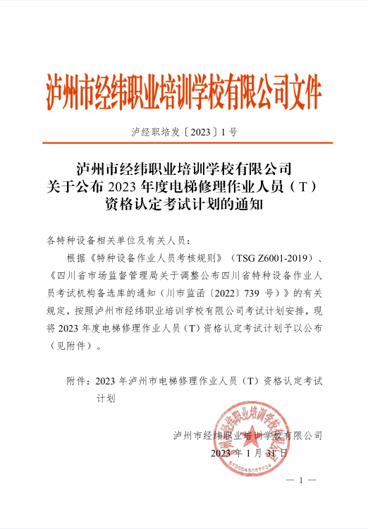 泸州市经纬职业培训学校有限公司关于公布2023年度电梯修理作业人员(T)资格认定考试计划的通知