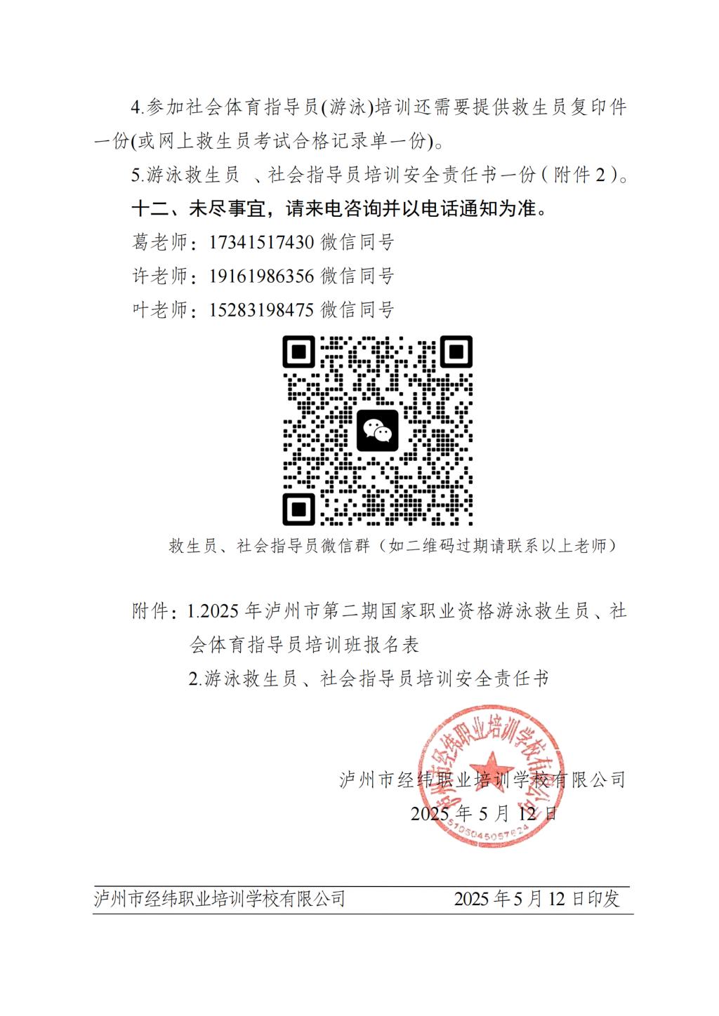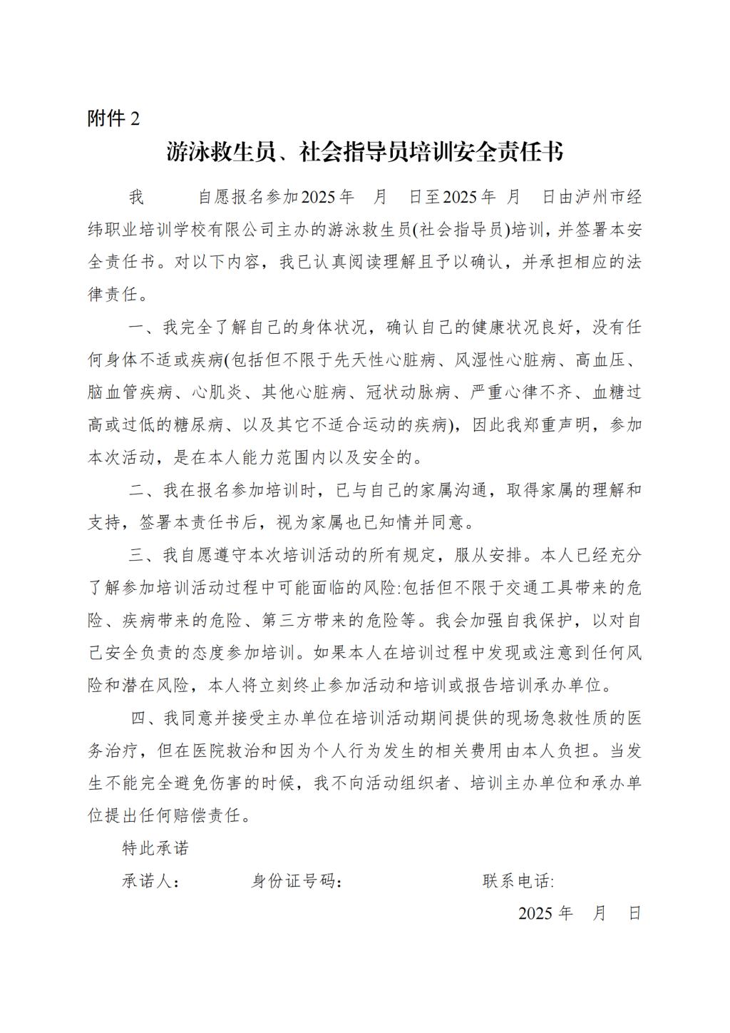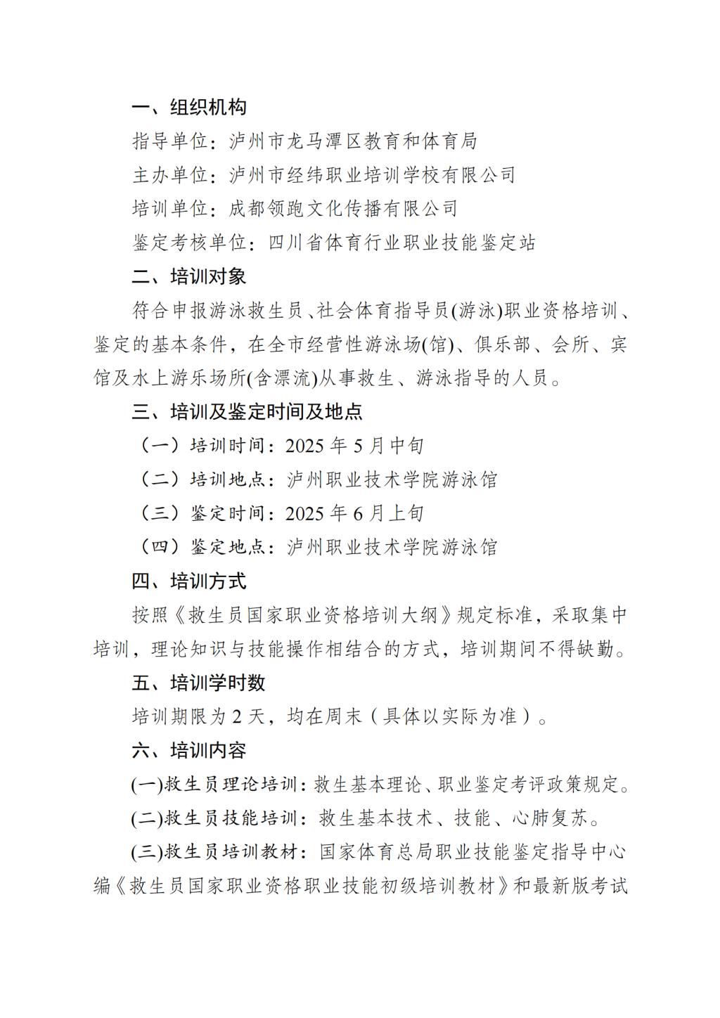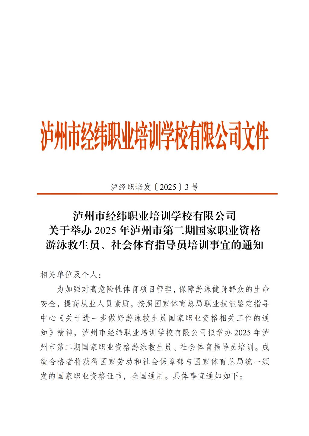 泸州市经纬职业培训学校有限公司 关于举办 2025 年泸州市第二期国家职业资格 游泳救生员、社会体育指导员培训事宜的通知
