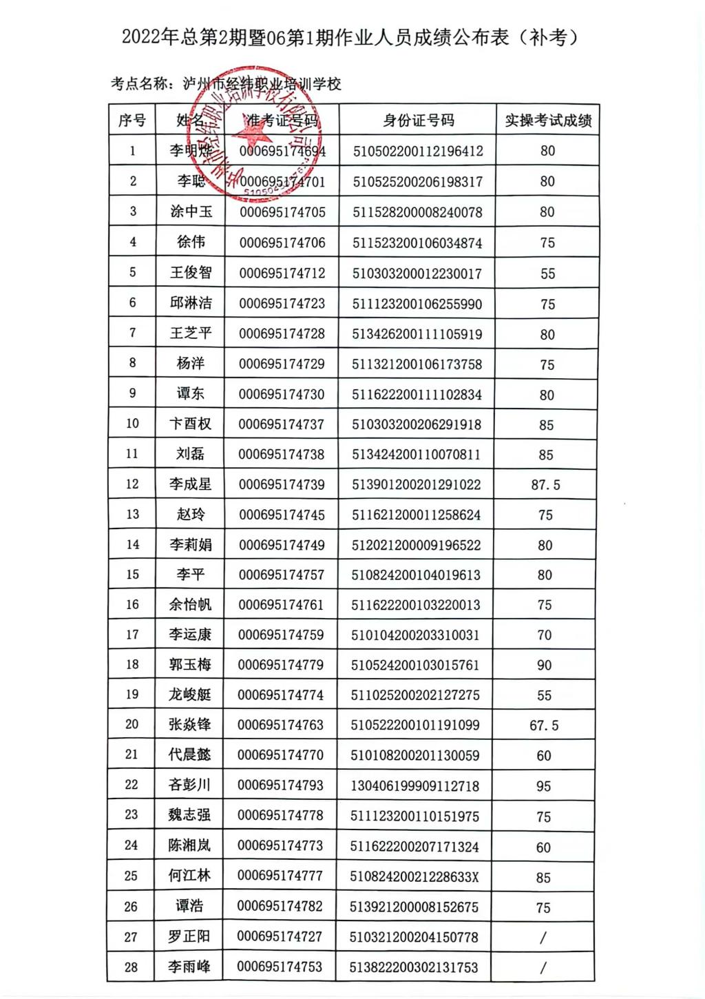 2022年总第2期暨06第1期特种设备作业人员(T)证实操(补考)成绩公示