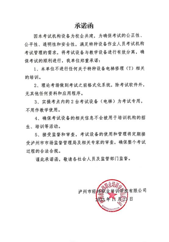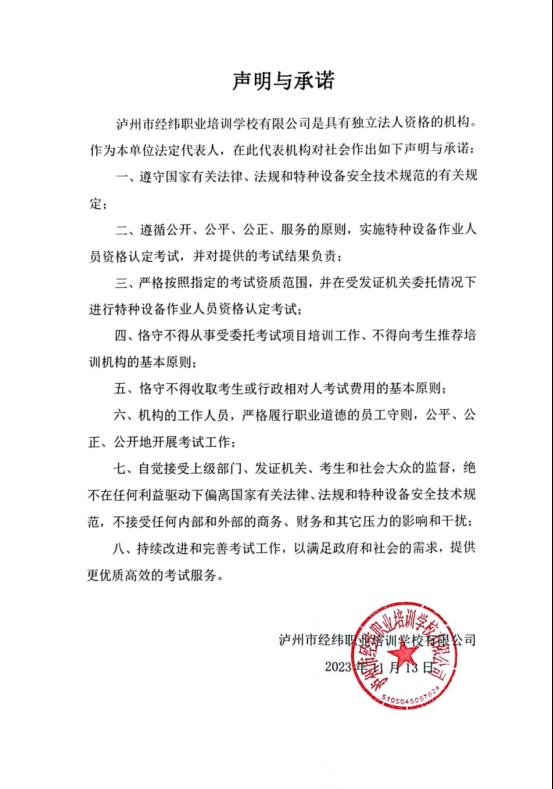 泸州市经纬职业培训学校有限公司关于特种设备作业人员考试机构的声明与承诺