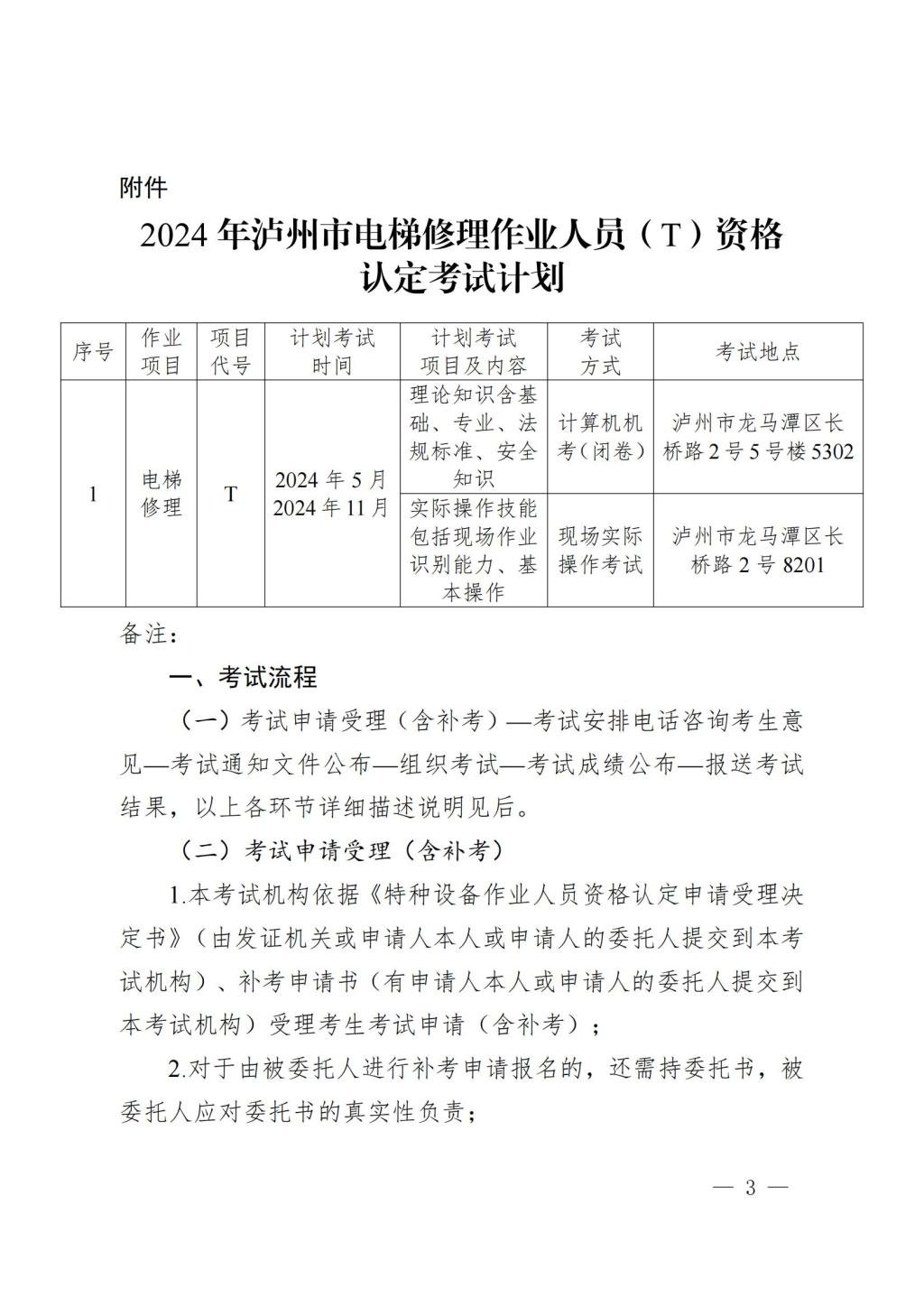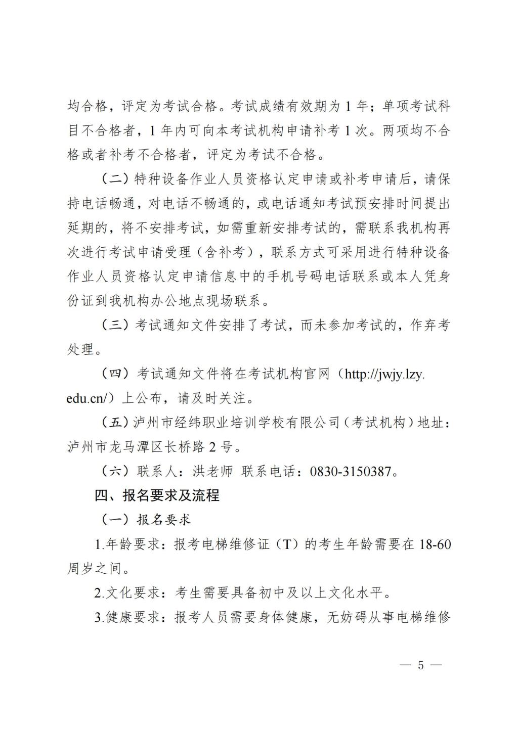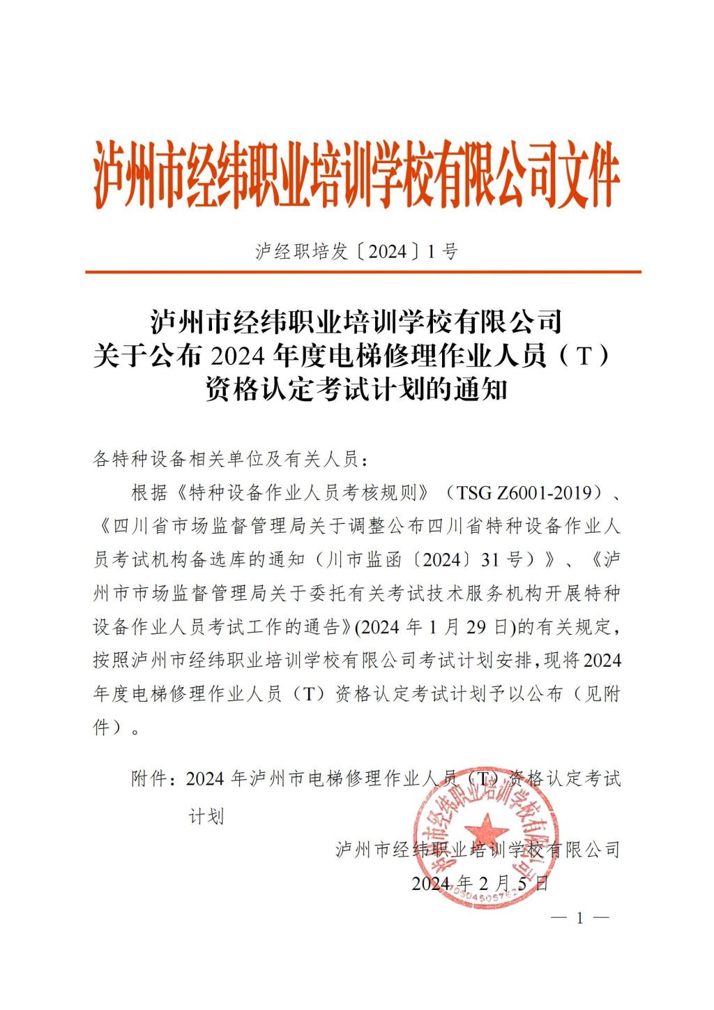 泸州市经纬职业培训学校有限公司关于公布2024年度电梯修理作业人员(T)资格认定考试计划的通知
