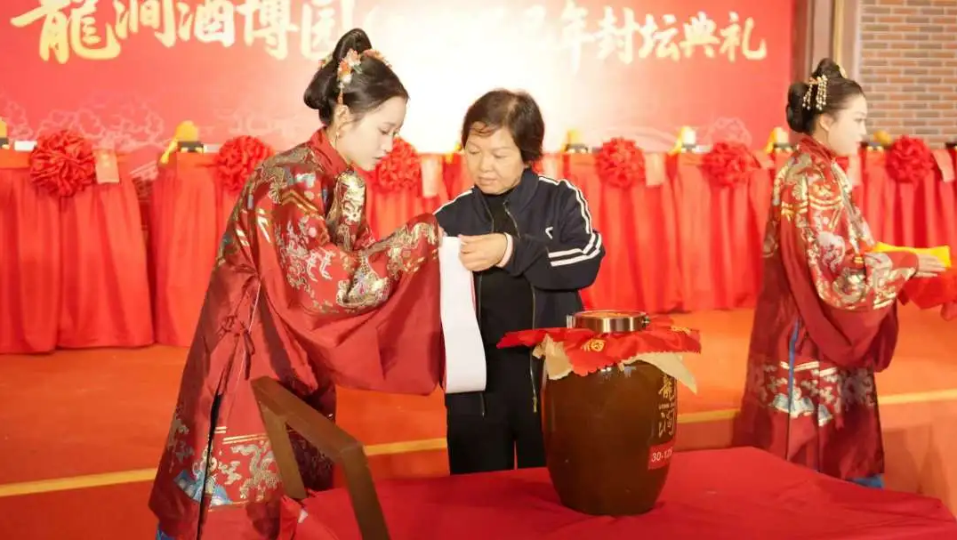 嘉宾们手持封条,将龙涧原浆酒封存于陶坛之中,静待时光酝酿出更为醇厚的美酒。