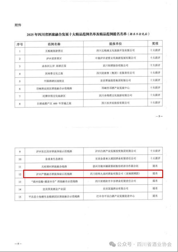 四川经纬九曲河酒业有限公司荣获2025年四川省酒旅融合发展十大精品范例